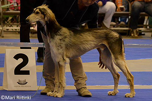 Aziz Otis BOB-puppy FINNISH SALUKI CLUB'S MAIN SPECIALITY SHOW 11.4.2015 HYVINKÄÄ (175 entries) 11.4.2015 Hyvinkää Saluki Speciality, DOGS: Lesley Brabyn (Timaru Salukis from USA)